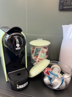 - Cucina completamente attrezzata con tutto il necessario per preparare pasti in totale autonomia, con frigo e freezer, piano cottura, forno, microonde, macchina del caffè a cialde, bollitore, frullatore